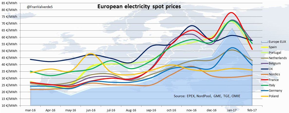 Este pasado febrero se ha visto como el precio medio de la electricidad en países como Francia, España, Portugal o Italia estaban muy parejos, por encima de los 50 euros MWh.