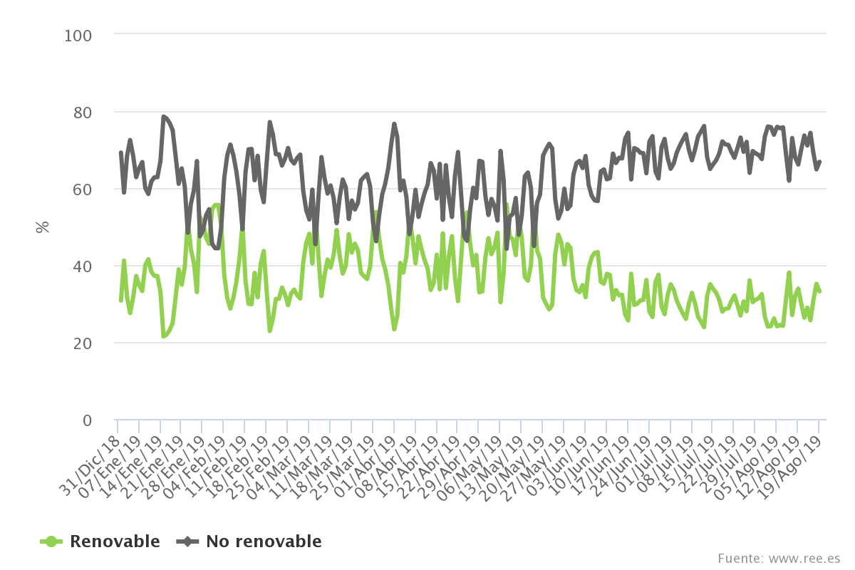 Esta gráfica es la evolución de la generación renovable frente a la no renovable durante 2019 hasta el 19 de agosto. Como se puede ver, solo hay tres o cuatro momentos en los que se producía más con renovables que con el resto de tecnologías. 2019 fue el año de los ciclos combinados y de la nuclear.