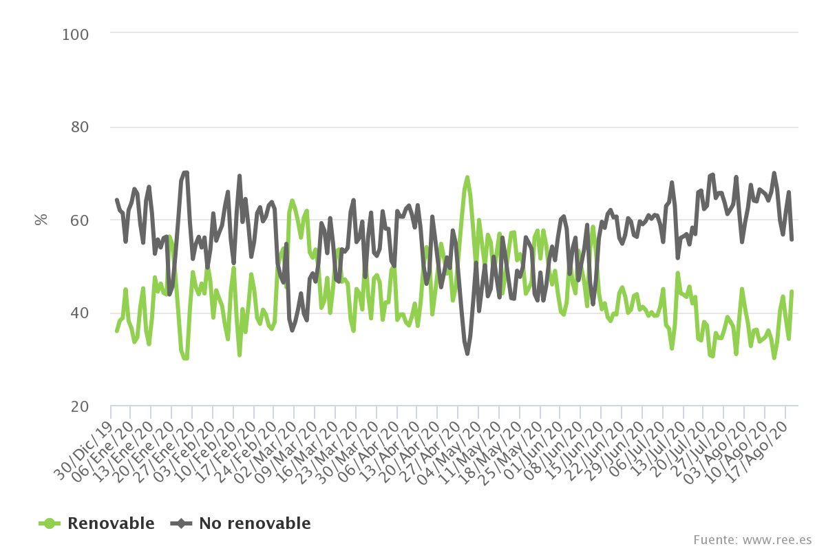 El parón de varias centrales nucleares durante la pandemia se ha hecho notar y las renovables han conseguido liderar durante muchas semanas la producción eléctrica frente al resto de tecnologías. Han estado por encima en marzo, a finales de abril, prácticamente todo mayo, buena parte de junio, hasta que llegó el verano y regresaron las nucleares y se volvió a la normalidad.