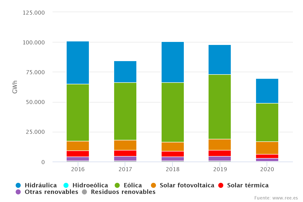 En esta comparativa de producción anual se puede ver perfectamente que en 2020 la evolución de la renovables ha ido a más. Este año será recordado por la maldita COVID-19, pero marcará un antes y un después en la generación renovable en España. La transición ahora sí parece que ha echado a andar.