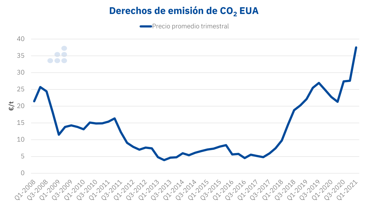 El precio promedio de los derechos de emisión de CO~2~ de los tres primeros meses de 2021 ronda los 37,50 € por tonelada, un precio trimestral que representa un récord absoluto y es 10 €/t más alto que el del último trimestre de 2020.