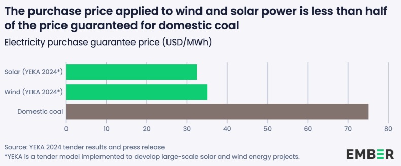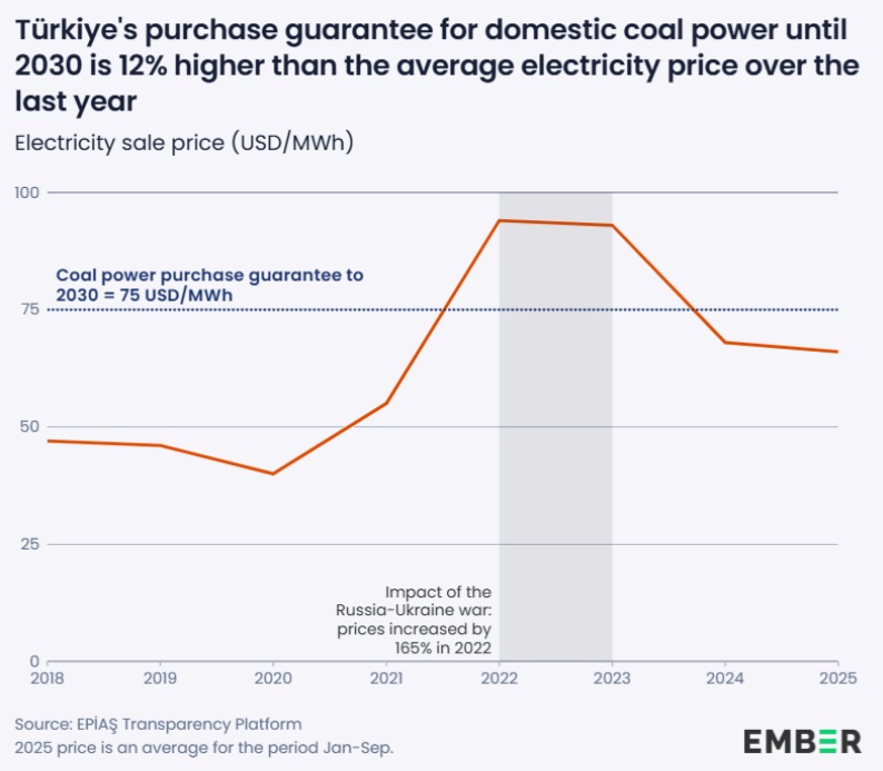 A pesar de la caída de los costes de las renovables, Turquía ha decidido ofrecer incentivos en dólares estadounidenses (USD) para las plantas de energía de carbón nacionales, a pesar de que sus gastos están en liras turcas (TRY). El precio de incentivo de 75 USD/MWh es un 12% superior al precio de venta medio (67 USD/MWh) durante el último año y un 36% superior al coste de generación de electricidad de las plantas de energía de carbón nacionales (55 USD/MWh).