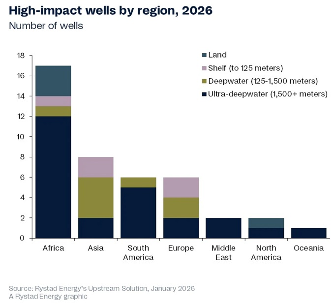 Los pozos se clasifican como de alto impacto en función de diversos factores: el tamaño de los recursos potenciales, si pueden abrir nuevas provincias de hidrocarburos en cuencas fronterizas o emergentes, y su importancia estratégica para el operador. Se espera que esta actividad en 2026 impulse aún más el dinamismo exploratorio en cuencas y países específicos, con 42 pozos de este tipo identificados a nivel mundial.