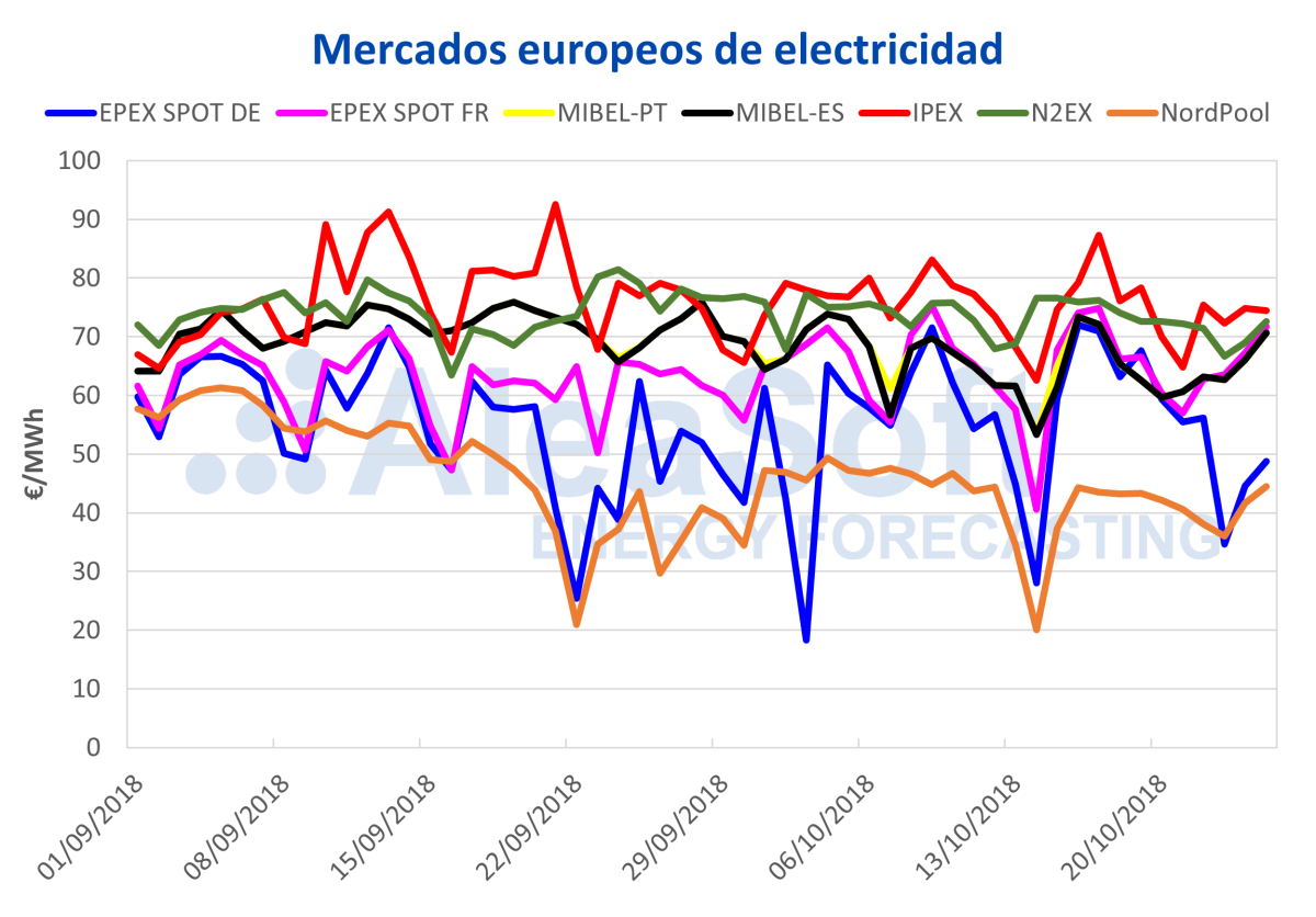 Por otra parte, durante esta semana, la tendencia en los principales mercados eléctricos europeos ha sido a la convergencia de precio. Los mercados MIBEL de España y Portugal, EPEX SPOT de Francia, IPEX de Italia y N2EX de Gran Bretaña se han agrupado alrededor de los 70 €/MWh. Y en otro nivel completamente distinto, los mercados EPEX SPOT de Alemania y NORDPOOL de los países nórdicos se han situado por debajo de los 50 €/MWh.