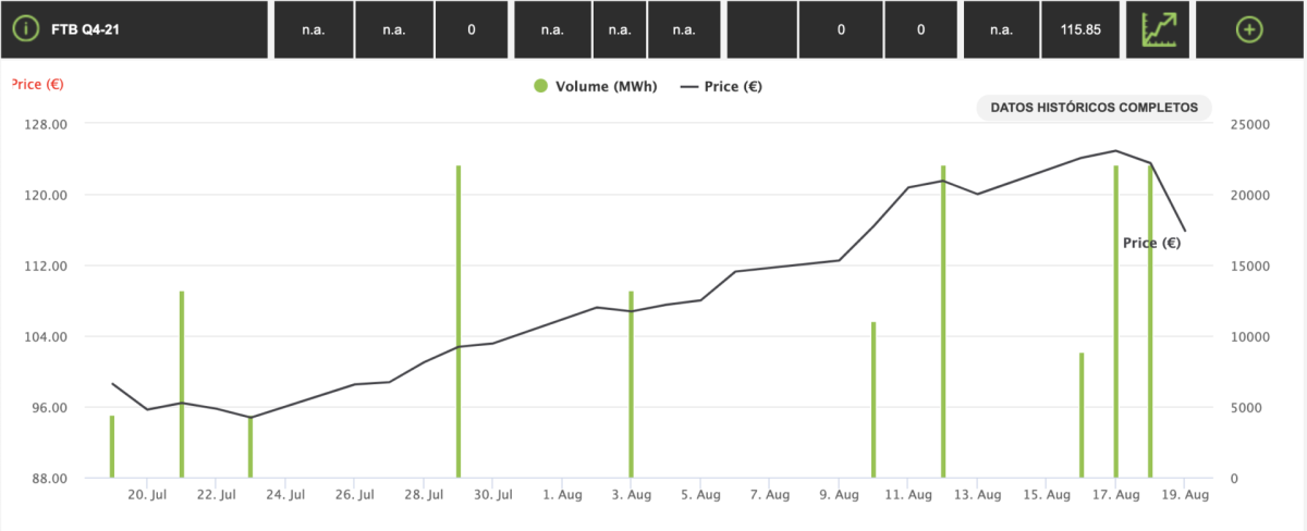Y todos estos datos también tiene su repercusión en el mercado de la electricidad. Si es la principal causa de la subida de precios récord, en este caso, también es la caausa de que los precios futuros de la electricidad hayan vivido una jornada histórica con una de las mayores caídas de los precios en la sesión. Todos los valores, semanales, mensuales, trimestrales y anuales cayeron con muccha fuerza, unos más que otros, pero cabe desstacar el comportamiento del Q4 (cuarto trimestre) que pasó de cotizar a 123,5 €/MWh de media a 115,85 €/MWh.