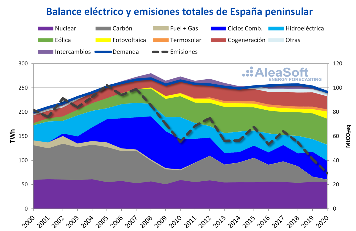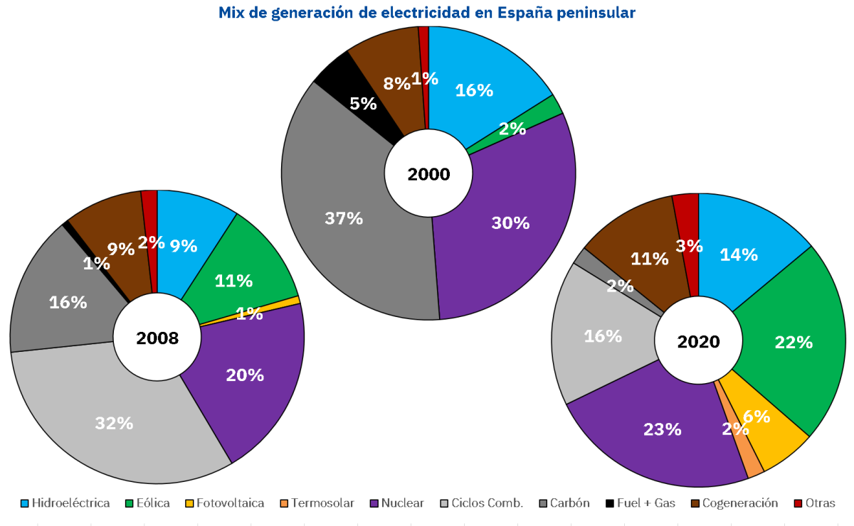 Durante los últimos 22 años, el sistema eléctrico ha pasado a estar dominado por la producción con carbón durante los primeros años, a una participación casi nula de esta tecnología desde el año 2020. En este período se han ido desarrollando nuevas tecnologías, como los ciclos combinados, la cogeneración, la eólica y la solar fotovoltaica, que han ido sustituyendo la producción con carbón. El aporte de las renovables en el año 2000 era de tan solo un 19% y en el año 2020 alcanzó el 47% y las emisiones totales del sector eléctrico se han reducido un 64% entre estos dos años. La nuclear ha proporcionado una potencia base durante todo este tiempo que ha aportado estabilidad al sistema y que demuestra la importancia de que el cierre de estas centrales se haga de forma ordenada para no afectar la transición energética. La hidroeléctrica ha sido otra energía que ha estado presente durante todo este período aportando también un volumen estable de energía “limpia”. La demanda eléctrica se mantuvo creciendo durante los primeros años hasta que se frenó con la llegada de la crisis para luego pasar a un período de mayor estabilidad gracias a la eficiencia energética. A partir de ahora la eólica y la solar fotovoltaica serán las protagonistas del futuro de la transición energética.