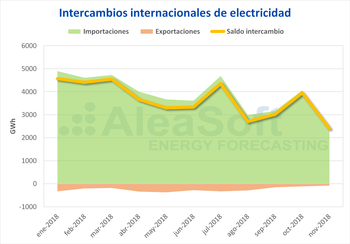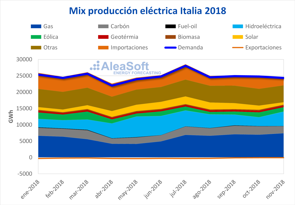 Italia es un importador neto de electricidad desde otros países. En los primeros once meses de 2018 el saldo de los intercambios internacionales representó un 14,8% de la demanda de electricidad, según los datos analizados por AleaSoft.