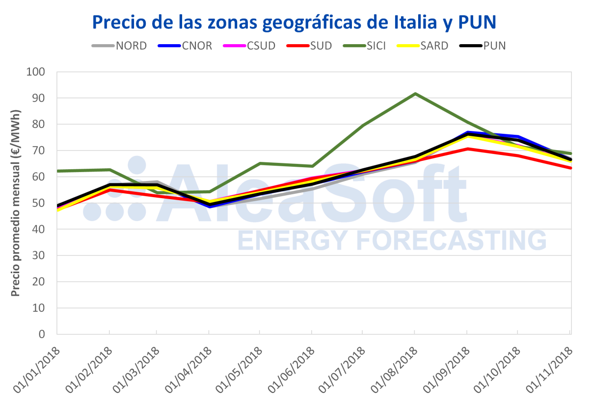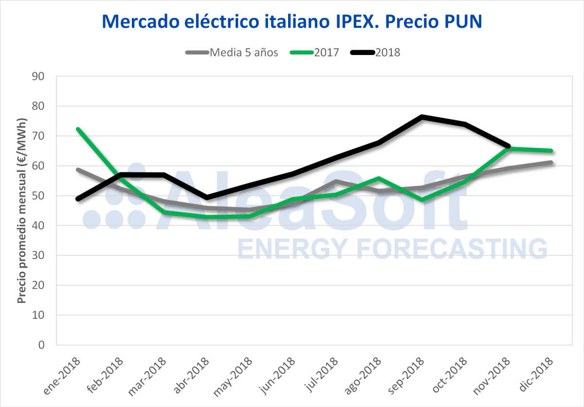 El precio PUN del mercado eléctrico italiano IPEX ha subido hasta noviembre de este año 8,01 €/MWh respecto a la media de los primeros once meses del 2017. Según el análisis realizado por AleaSoft este aumento del precio ha sido provocado por el aumento del precio de los combustibles y de los derechos de emisiones de CO~2~, que afecta especialmente a Italia donde un porcentaje alto de la demanda se cubre con producción térmica. En los primeros once meses del 2018 el mercado italiano se ha colocado como el segundo de mayor precio entre los principales mercados europeos por detrás del mercado británico N2EX.