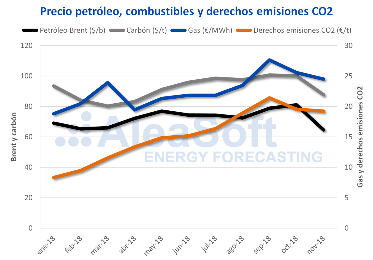 El hecho de que la demanda de Italia se cubra en un alto porcentaje con producción térmica hace que el precio del mercado eléctrico italiano esté muy influenciado por el precio de los combustibles y de los derechos de emisiones de CO~2~, y esto es lo que ha sucedido este año en que se ha producido un aumento generalizado de los mismos. Si se compara el precio medio de los combustibles y de los derechos de emisiones de CO~2~ en los primeros once meses de 2018, con el precio medio del año 2017, nos encontramos los siguientes datos: el Brent ha subido 18,06 $/bbl, el gas, 5,35 €/MWh, el carbón, 8,95 $/t y el CO~2~, 9,45 €/t.