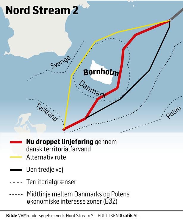 Finalmente, el 15 de abril de 2019, Nord Stream 2 solicitó dos alternativas de ruta en la plataforma continental al sureste de Bornholm con una longitud de 147 km y 164 km respectivamente. De entre las dos alternativas, la DEA aprobó la ruta más corta, ya que esta ruta proporciona el menor riesgo e impacto desde una perspectiva ambiental y de seguridad y, por lo tanto, es la opción preferida.