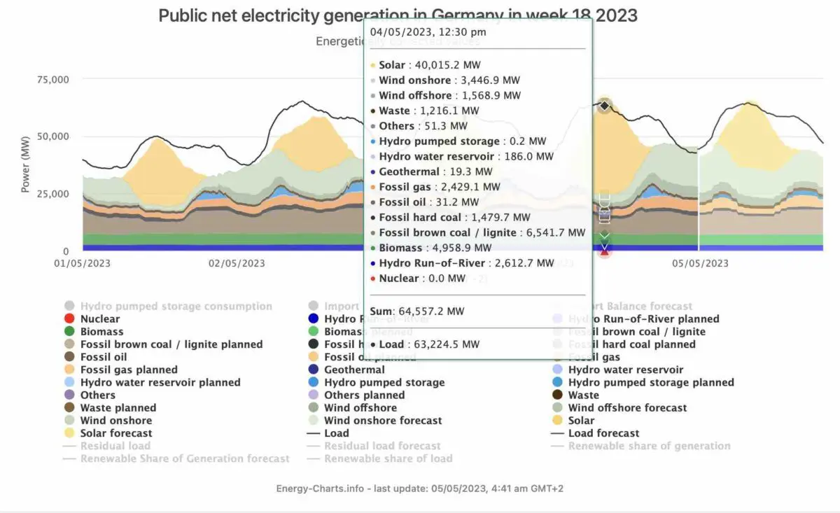 El gráfico de Energy-Charts muestra que la producción solar, con algo más de 40 gigavatios (GW) era más de seis veces mayor que cualquier otra fuente en ese momento y representaba casi dos tercios del total de 64,6 GW, de los cuales alrededor de 1,3 GW se exportaban a otros países. La generación con lignito era la segunda mayor en ese momento, con un total de 6,5 GW, seguida de la biomasa (casi 5 GW) y la eólica terrestre (más de 3,4 GW).
