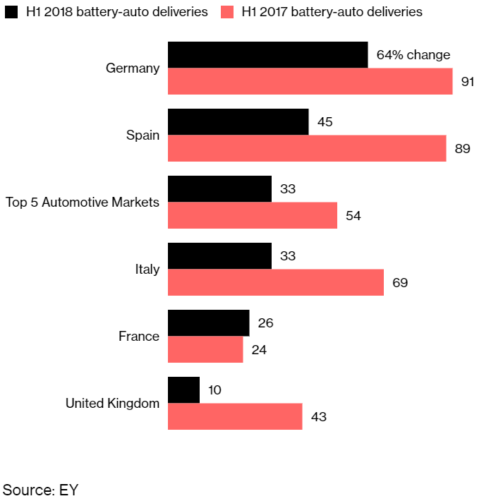 **Las ventas de coches eléctricos e híbridos enchufables se han frenado en la mayoría de los principales mercados de la Unión Europea durante la primera mitad de 2018. **Las matriculaciones han crecido un 33% durante este periodo, frente a un 54% en el mismo periodo del pasado año, lo que evidencia una ralentización en la electrificación del parque automovilístico europeo. Según un informe publicado por la consultora EY, la fuerte demanda en Alemania, el mayor mercado de la Unión Europea, no ha sido suficiente para compensar el “débil crecimiento” del vehículo eléctrico en el Reino Unido, que es el segundo mayor mercado del continente.