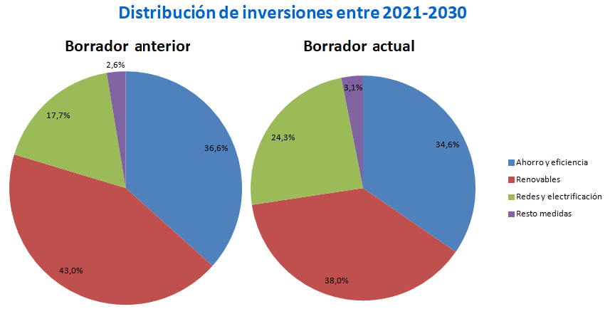 Otro punto que se modificó fue la estimación de las inversiones en el período 2021-2030. En este caso se aumentó el total de inversiones necesarias para lograr los objetivos del PNIEC de 236 mil millones de euros a 241 mil millones de euros. A pesar de este aumento, se redujeron las cantidades destinadas a energías renovables y ahorro y eficiencia energética. De esta forma, se dispondrá para energías renovables de 9871 millones de euros menos que lo planificado en el plan anterior, mientras que para ahorro y eficiencia la cifra se redujo en 2936 millones de euros. Por el contrario, en esta actualización del plan fueron las redes y la electrificación las más beneficiadas, con un incremento en el presupuesto de 16 733 millones de euros con respecto al plan anterior.