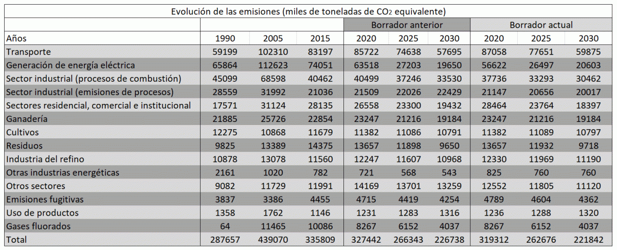 Existen también notables cambios en cuanto a la dimensión de la descarbonización. En este sentido, en el anterior borrador el objetivo era la reducción de los gases de efecto invernadero desde los 340 MtCO~2~-eq emitidos en 2017 a los 227 MtCO~2~-eq para el año 2030. En el borrador modificado se contempla una disminución hasta los 222 MtCO~2~-eq.