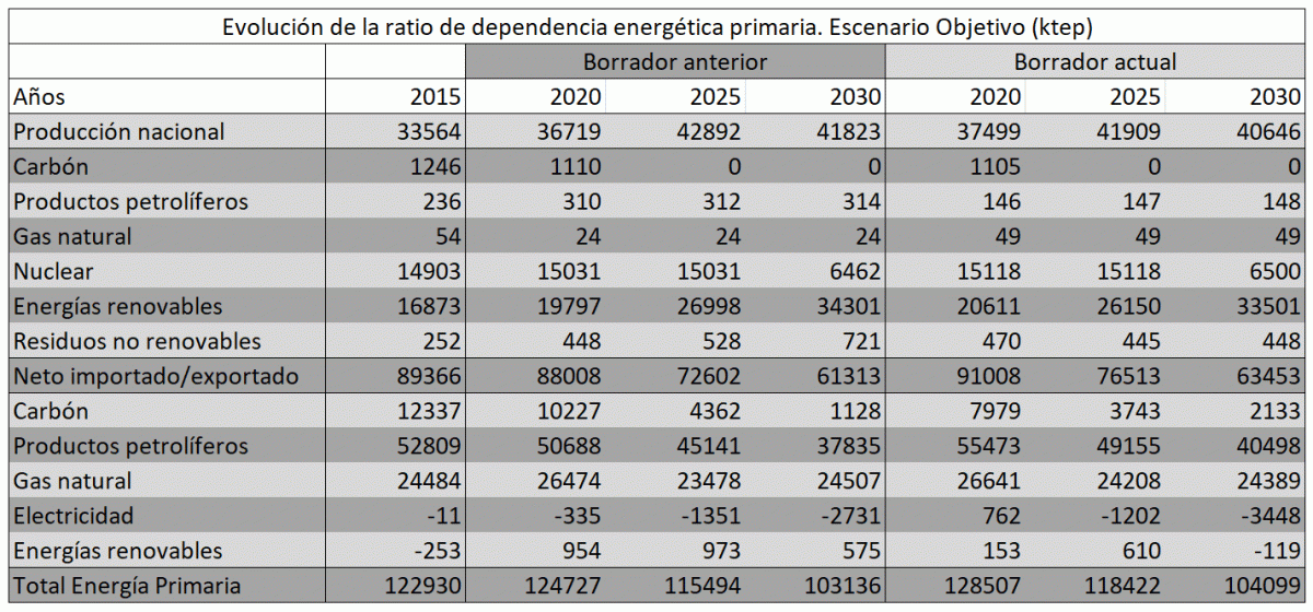Como resultado de las medidas contempladas en el PNIEC, 2021-2030, la relación de dependencia energética de España disminuirá en 2030. En este punto, la reciente actualización del PNIEC propone una evolución más realista que de la propuesta del borrador anterior, pues supone que para 2030 la dependencia energética en España será del 61%, o sea, dos puntos porcentuales por encima. Específicamente en el caso de la importación de combustibles fósiles (carbón, petróleo y gas) en la actualización del plan se espera sea para 2030 de 67 020 ktep, mientras que en el plan anterior se esperaban 63 470 ktep para igual fecha.