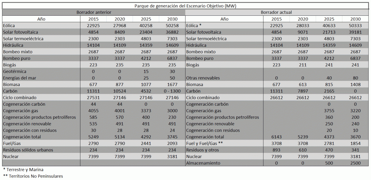 El aumento en la generación con tecnologías renovables propuesto en esta actualización va encaminado, entre otras cosas, a suplir la necesidad de generar con carbón, tecnología para la cual no sólo disminuye considerablemente su utilización para 2020 y 2025, sino que ahora sí se define su la eliminación antes de 2030. En el caso de la cogeneración con gas, la potencia propuesta para finales de esta década en el Escenario Objetivo aumenta de los 3,0 GW del borrador anterior a los 3,2 GW del nuevo borrador y se mantienen las medidas para impulsar la cogeneración de alta eficiencia con un total de 1,2 GW, para lo cual el mecanismo previsto es el establecimiento de un calendario plurianual de subastas.