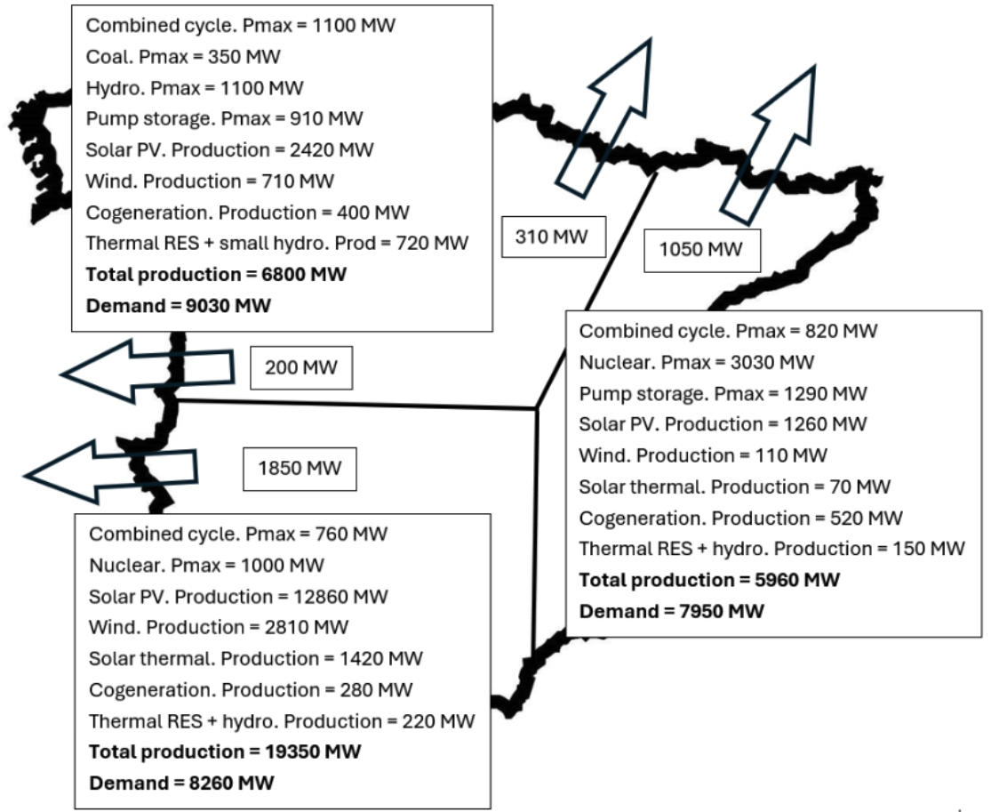 "La siguiente figura ilustra la combinación de generación en España y su heterogénea distribución antes del incidente, dividiendo la red eléctrica española en tres zonas equivalentes en términos de demanda. Los valores mencionados en la figura muestran que el suroeste de España está impulsando la electricidad hacia el centro-norte y el este", señala. Este es el mapa.