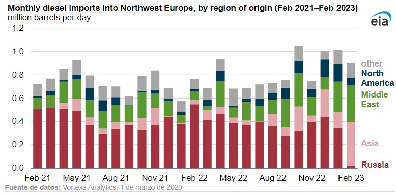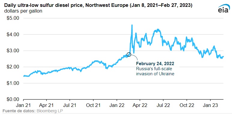 El precio del diésel ultra bajo en azufre (ULSD) en el noroeste de Europa cayó de 3,29 dólares por galón (gal) el 23 de enero de 2023 a 2,65 dólares/gal el 27 de febrero de 2023, que es menos que el precio del 23 de febrero de 2022 (el día antes de la invasión a gran escala de Ucrania por parte de Rusia).