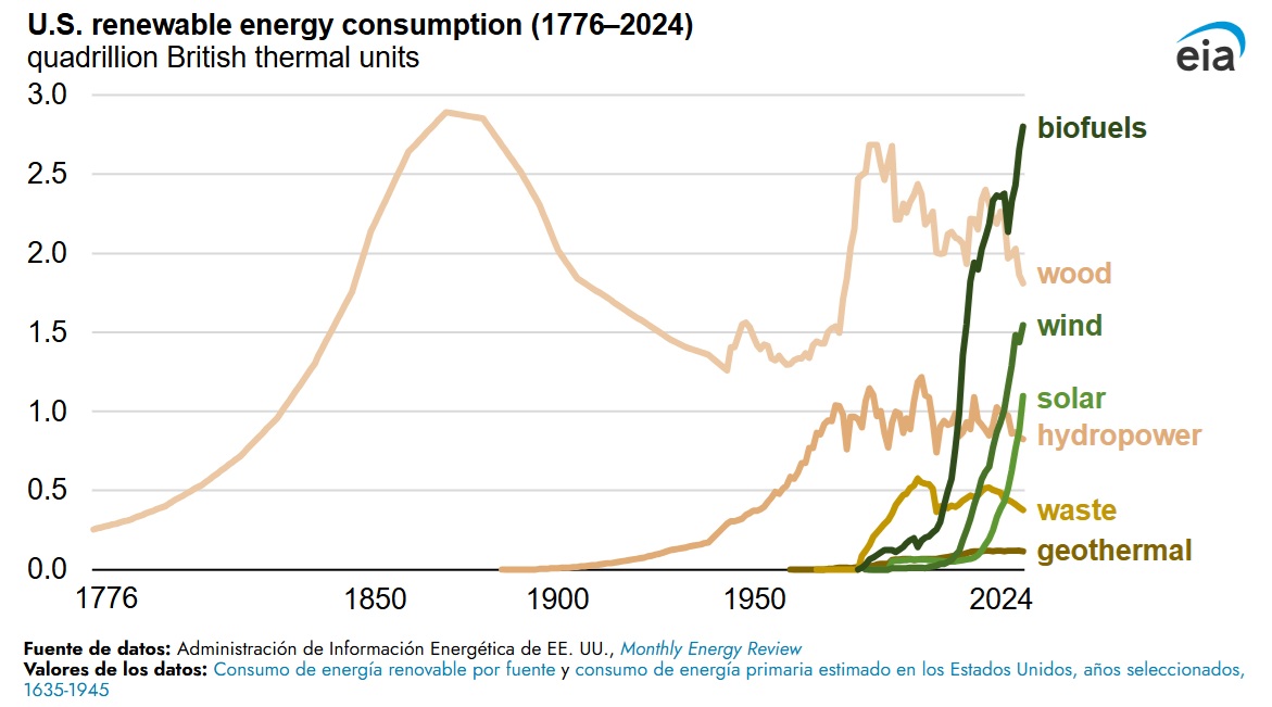 Cuando se firmó la Declaración de Independencia en 1776, la madera, una fuente de energía renovable, era la principal fuente de energía en Estados Unidos. Utilizada para calefacción, cocina e iluminación, la madera siguió siendo la principal fuente de energía en Estados Unidos hasta finales del siglo XIX, cuando el consumo de carbón se generalizó. La dendroenergía aún se consume, principalmente en plantas industriales de madera y papel que queman el exceso de residuos de madera para generar electricidad.