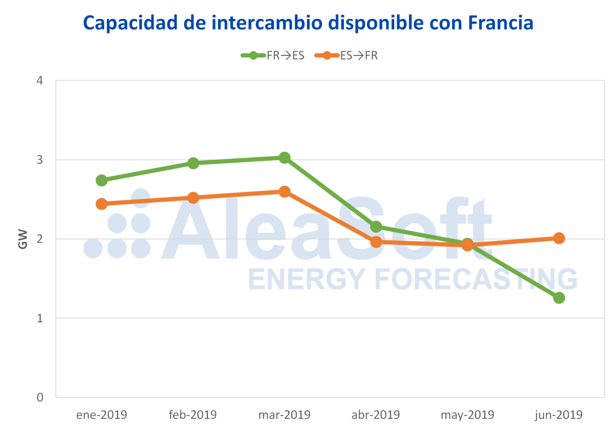La capacidad de intercambio disponible con Francia se ha reducido de forma considerable en el segundo trimestre de este año si se compara con la disponible en el primer trimestre: un 39% en el sentido de Francia a España y un 22% en el sentido inverso, lo que ha favorecido la caída de las importaciones y las exportaciones con Francia en el trimestre recién concluido comentadas anteriormente.