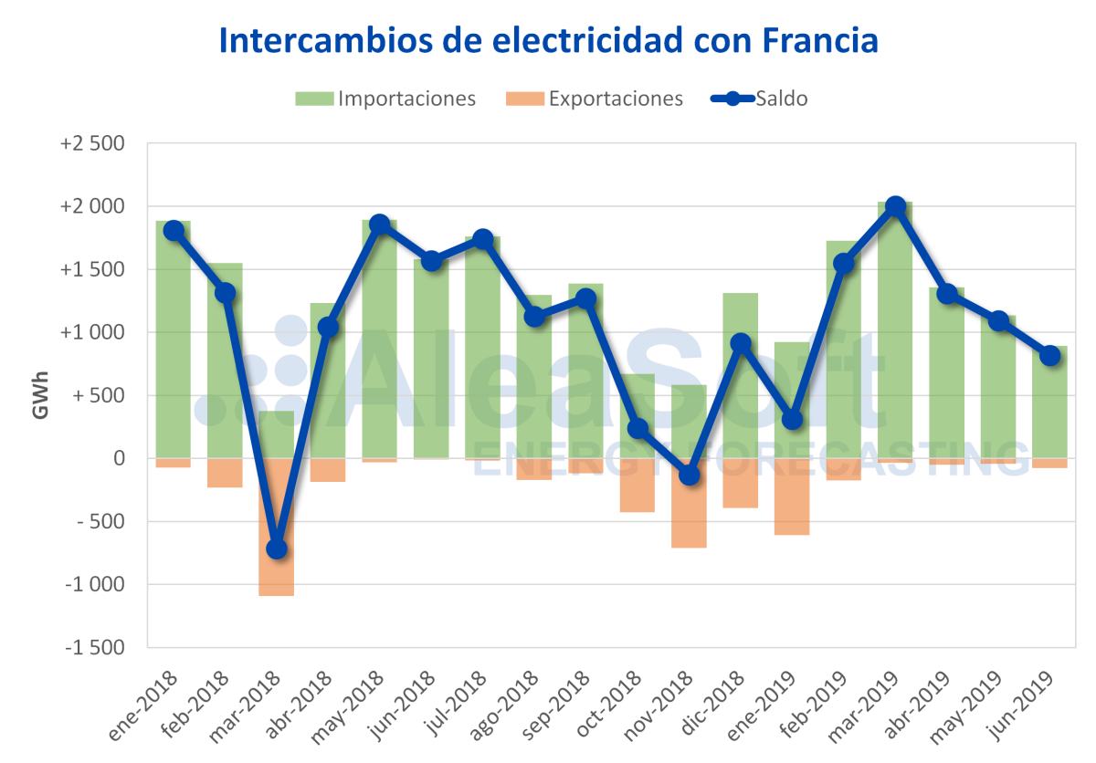 El balance neto de intercambios de electricidad entre España y Francia durante el primer semestre del año situó a España como importador neto con 7080 GWh netos importados. Entre abril y junio disminuyeron tanto las importaciones como las exportaciones con el país galo, un 28% y un 27% respectivamente en términos interanuales, lo que hizo que en el global del semestre también se registraran caídas interanuales de las importaciones, de un 5,2%, y de las exportaciones, de un 39%.
