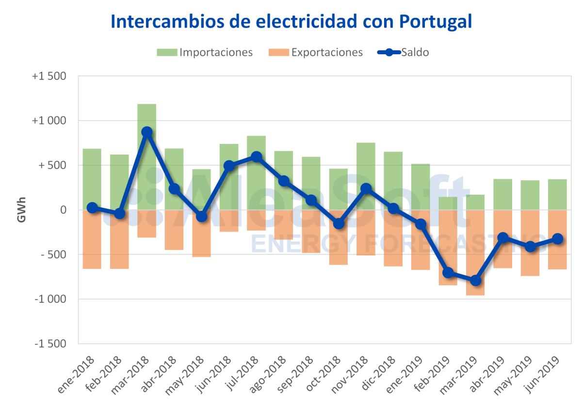 En todos los meses del primer semestre de 2019, el balance neto de intercambios de electricidad entre España y Portugal situó a España como exportador neto. El balance neto total de los seis primeros meses del año es de 2692 GWh exportados. En este período las exportaciones aumentaron un 59% en términos interanuales.