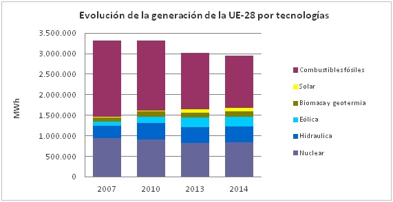 En este sentido, como se puede ver en el gráfico, la apuesta por las renovables de la UE empieza a dar sus frutos. Se ha pasado de una cobertura de la demanda del 15% en 2007 a más del 28% en 2014. El beneficio ha sido importante en términos de lucha contra el cambio climático: el pasado año un 57% de la generación estaba libre de emisiones de CO~2,~ frente a sólo un 44% en 2007.