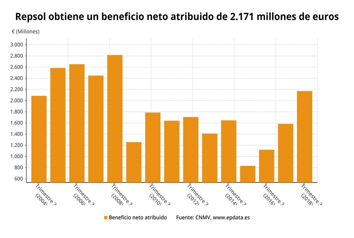 Repsol obtuvo un beneficio neto de 2.171 millones de euros hasta septiembre, lo que representa un incremento del 37% con respecto al mismo periodo del año anterior y el mejor resultado en los nueve primeros meses de un ejercicio del grupo en los últimos diez años, informó la compañía.