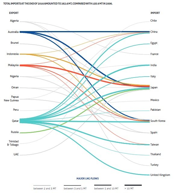Más datos. Del total, 74,6 millones de toneladas fueron negociadas a spot, a corto plazo, lo que supone el 28% del comercio total y el 73% de la demanda mundial de GNL se genera en Asia. Qatar sigue liderando las exportaciones mundiales con un porcentaje de suministro del 30% global, mientras que la Cuenca del Pacífico se queda con el 45% del total. Como novedad, hay cuatro nuevos países importadores de un total de 39, que se nutren de 19 países exportadores. Y el crecimiento se reafirma también en los once nuevos terminales de regasificación que se han construido en 2016.