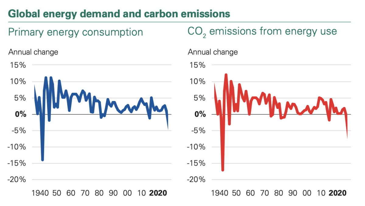 - Las emisiones de CO~2~ derivadas del uso de la energía se redujeron en más de un 6% en 2020, el mayor descenso desde 1945.