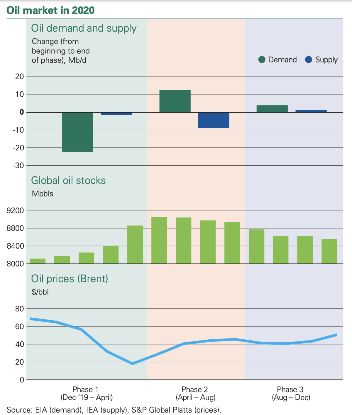 - El precio medio del barril de petróleo (Brent) fue de 41,84 dólares en 2020, su precio más bajo desde 2004.