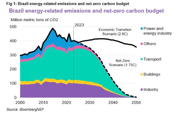Brasil necesita múltiples vías tecnológicas para alcanzar el cero neto, incluidas la electrificación, la captura de carbono, el hidrógeno, la bioenergía y la energía limpia, según BloombergNEF