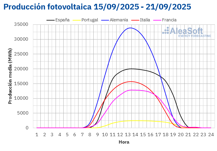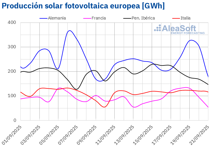 Durante la semana del 22 de septiembre, según las previsiones de producción solar de AleaSoft Energy Forecasting, la tendencia alcista se revertirá y la producción solar fotovoltaica caerá en los mercados español, italiano y alemán.