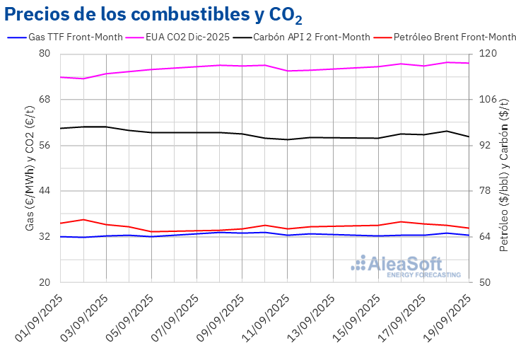 Sin embargo, España, Portugal y Francia rompieron la tendencia con subidas, mientras que Italia se mantuvo por encima de los 100 €/MWh la mayor parte de la semana. Durante estos días se alcanzaron nuevos récords históricos de producción solar fotovoltaica para un día de septiembre en España, Portugal y Francia. Alemania y Portugal también destacaron por repuntes de la generación eólica. El 18 de septiembre los futuros de CO2 alcanzaron su precio de cierre más alto desde mediados de febrero, de 77,82 €/t.