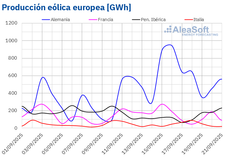 El 16 de septiembre, el mercado alemán generó 944 GWh de producción eólica, valores no vistos desde mediados de enero de 2025. Asimismo, el 21 de septiembre, en el mercado portugués la producción eólica diaria alcanzó los 73 GWh, nivel observado por última vez a finales de abril de 2025.