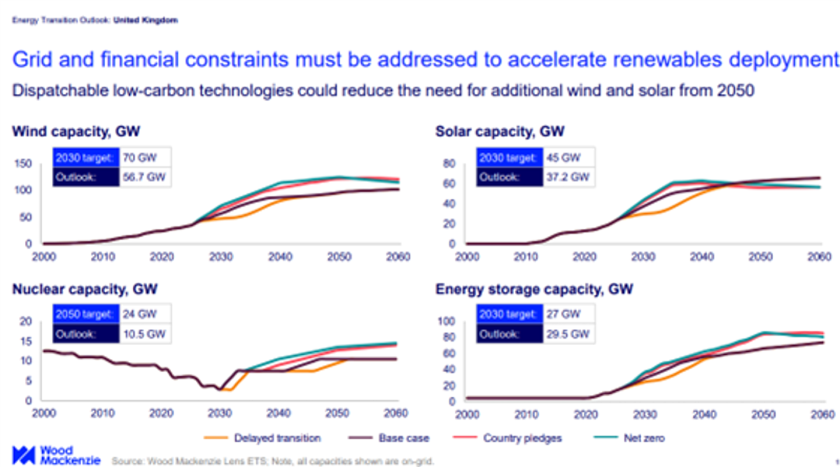 Las prioridades tecnológicas están evolucionando. El gobierno seleccionó a Rolls-Royce para un proyecto piloto de reactores modulares pequeños, y Wood Mackenzie prevé la primera generación de SMR conectados a la red a principios de la década de 2040. Una Zona de Crecimiento de IA integrará centros de datos con SMR, aunque, en el escenario base, estos últimos cubrirán menos del 2 % de la demanda total de energía para 2030. La capacidad nuclear alcanzará los 10,5 GW para 2050 en el escenario base, muy por debajo del objetivo gubernamental de 24 GW.