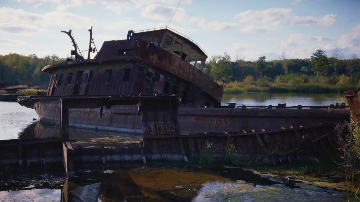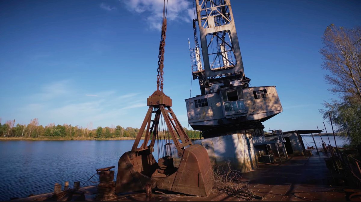 En las afueras de la ciudad de Chernobyl se encuentra otro vestigio de la era industrial: una grúa flotante. Su función era servir en la construcción y en el transporte de cargas pesadas para la central nuclear. Tras el accidente, la grúa dejó de utilizarse. Permaneció en su lugar, parcialmente sumergida en el agua y cubierta de óxido.