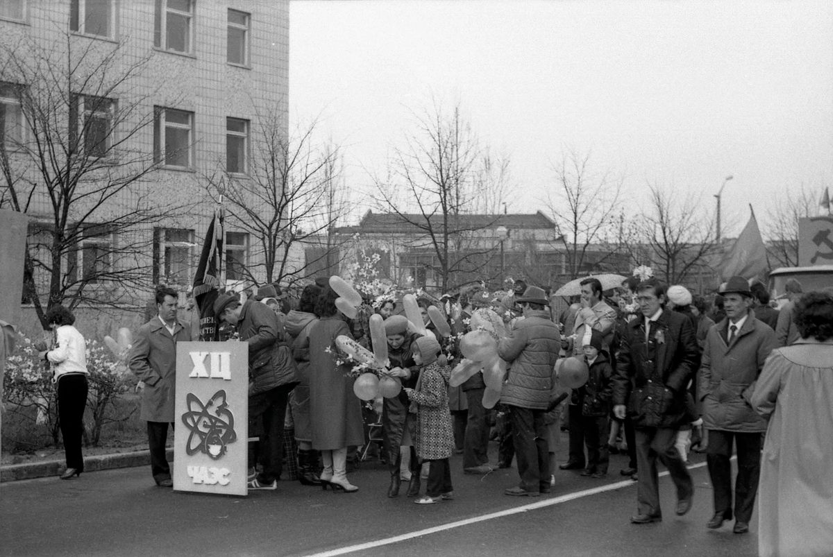 Un grupo de niños se reúne para un desfile que celebra el éxito de la central nuclear de Chernóbil en abril de 1986, apenas unas semanas antes del accidente. En el extremo derecho se puede observar al director de la planta, Viktor Bryukhanov (con sombrero y corbata), y al secretario del Partido de la central, Sergey Parashin (con gafas). Petr Vyhovsky/Pripyat-city.ru