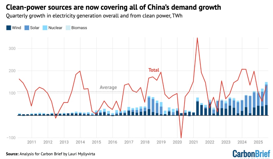Las emisiones de China ya han disminuido anteriormente durante desaceleraciones económicas. Lo que es diferente esta vez es que la demanda de electricidad está creciendo (un 3,7 por ciento en el primer semestre de este año), pero el aumento de la energía solar, eólica y nuclear ha superado eso fácilmente, según Myllyvirta, que analiza los datos más recientes en un estudio publicado en el sitio web de Carbon Brief.