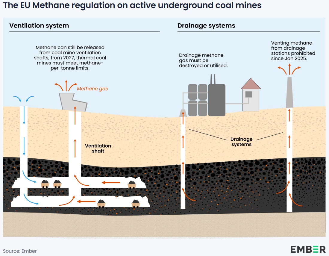 El Reglamento de la UE sobre el metano prohíbe la ventilación rutinaria de metano de los sistemas de drenaje y exige que los operadores de minas utilicen el gas o lo quemen con una eficiencia de al menos el 99%.