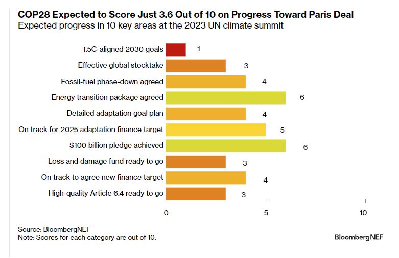 - Se espera que la cumbre de la ONU obtenga solo 3,6 sobre 10 en avances en 10 áreas clave cruciales para alcanzar los objetivos del Acuerdo de París, según el análisis de BloombergNEF.