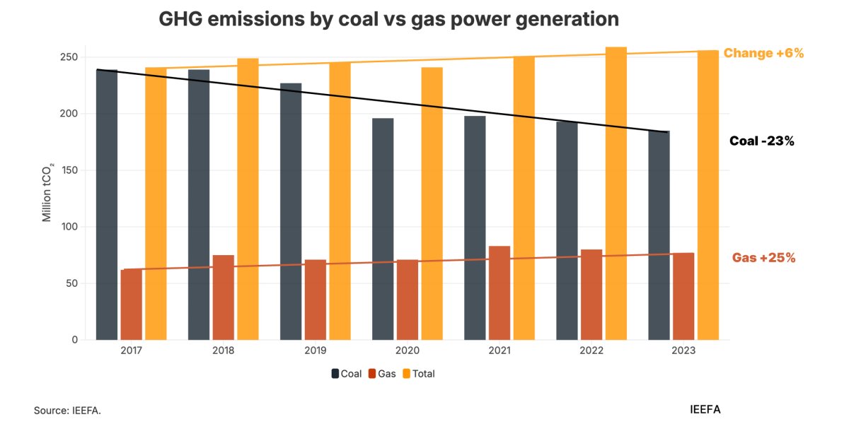 Si la capacidad retirada es reemplazada por gas natural licuado en lugar de energías renovables, se socavarían las reducciones esperadas de emisiones de gases de efecto invernadero, según IEEFA