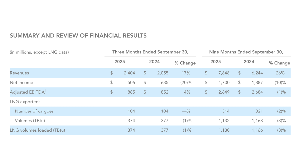 En los nueve primeros meses del año, Cheniere registró un incremento de los ingresos del 28%, hasta los 14.530 millones de dólares, mientras que el beneficio neto creció un 33%, hasta los 3.030 millones, lo que sitúa el margen neto en torno al 21%. Solo en el tercer trimestre, la compañía volvió a mostrar un fuerte crecimiento, impulsado principalmente por precios más altos del gas natural en mercados clave como Europa.