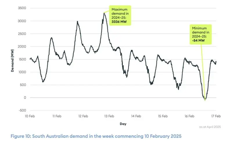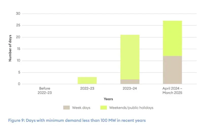 Antes de 2022-23, según ElectraNet, Australia Meridional nunca había experimentado un día en que la demanda mínima hubiera caído por debajo de los 100 megavatios. De hecho, hasta 2015, los niveles de demanda mínima solían superar los 1.000 MW.
