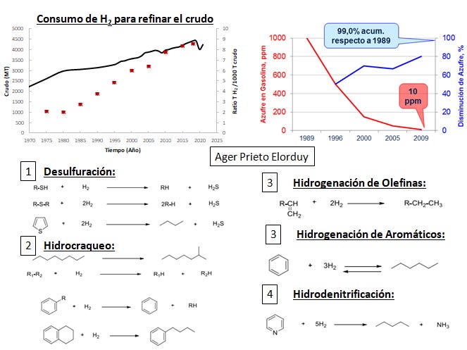 Desde que comenzó la ola del hidrógeno hace aproximadamente 5 años, muchos son los usos que se le han estimado al hidrógeno. Es por todos sabido que hoy en día, que la producción y consumo de hidrógeno han estado muy ligados al refino de petróleo y a la fabricación de fertilizantes vía amoniaco. En España se consumen anualmente, 0,5Mt de H₂, distribuidas a grandes rasgos entre 70% refinerías y 30% para la fabricación de amoniaco. En la siguiente infografía que he elaborado, podéis observar los principales usos en las refinerías.