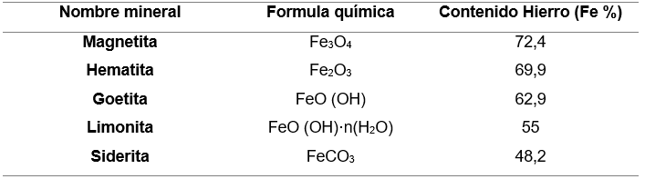Como se puede comprobar en la siguiente tabla, el contenido del hierro varía en función de la composición química de cada mineral. El contenido de hierro clasifica en 3 grupos los minerales de hierro. En primer lugar, de alto grado (>65% Fe), grado medio (62–65% Fe) y bajo grado (<62% Fe). Cabe resaltar que un mayor contenido en hierro en el sustrato inicial favorecerá la reducción por hidrógeno al minimizar las impurezas presentes.
