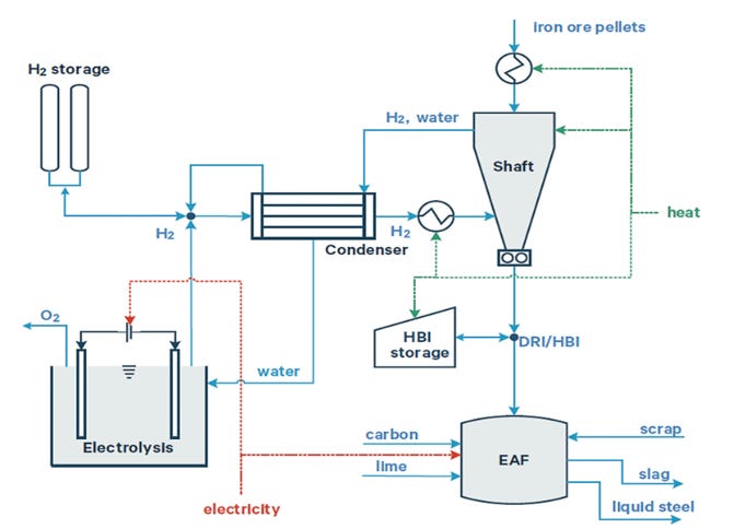 Por esa razón, como se puede observar en la imagen 8, el condensador que está acoplado a la corriente de salida del reactor donde se da el DRI es fundamental. Ya que será necesario reducir el contenido del agua de la mezcla de salida de hidrógeno y agua. Por lo tanto, la ruta completa de la producción de acero verde tendría la siguiente forma.