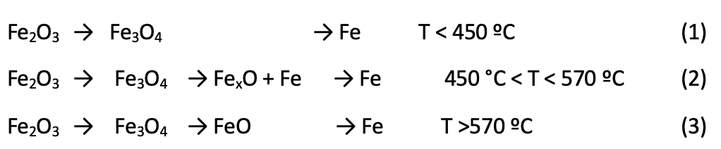 Como podemos observar seguidamente, la reducción se puede dar en 2 o 3 etapas. Por debajo de 450ºC la fase de wüstite (FeO) no aparece y por lo tanto, en dos etapas se consigue alcanzar el hierro elemental. Sin embargo, como se explicará más adelante, para favorecer la reducción será necesario operar a temperaturas superiores a 570 ºC, aunque ello implique 3 etapas de reducción.