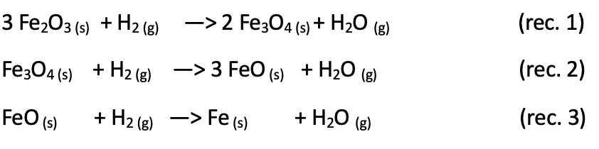 Seguidamente se pueden observar las reacciones químicas de reducción del mineral de hierro para la obtención de hierro puro mediante hidrógeno, y las reacciones donde el reductor es el monóxido de carbono (CO) son idénticas, pero el producto obtenido es dióxido de carbono (CO2), en vez de agua.