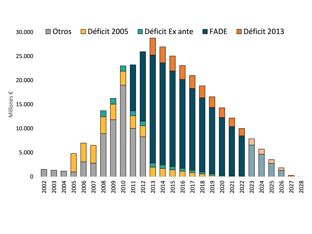 La anualidad estimada de los derechos de cobro correspondientes a la deuda del sistema eléctrico asciende a 2.354 millones de euros para el año 2023, un 2,23% inferior a la de 2022. Sobre esta cantidad se añadirán los ajustes derivados de amortizaciones de bonos del FADE, que se estima que asciendan a 27 millones.